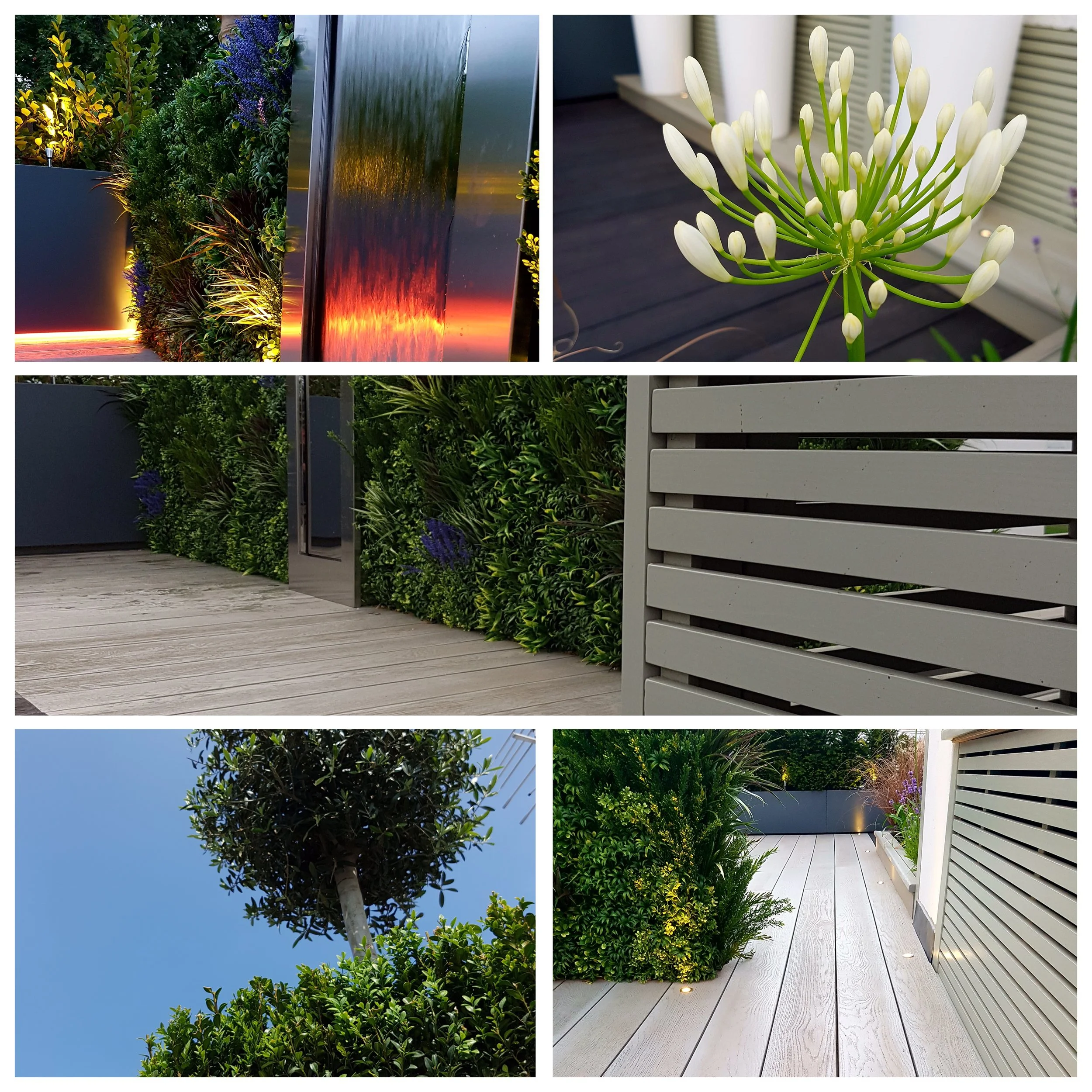 A Central London penthouse roof terrace complete with Millboard decking and water wall, Olive trees, bespoke trellis screening, jacuzzi, child’s play zone, lounge with dining zone and putting green